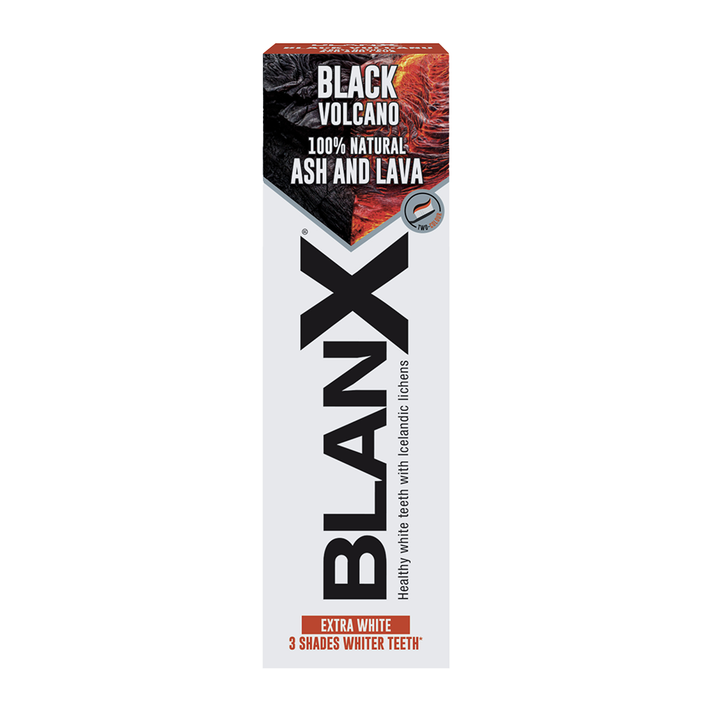 NATURE AND SCIENTIFIC RESEARCH FOR EXTRA WHITE TEETH BlanX® Black Volcano is the new BlanX® toothpaste based on 100% Natural Icelandic Lichens, Ash and Lava that provides 3 shades whiter teeth*.