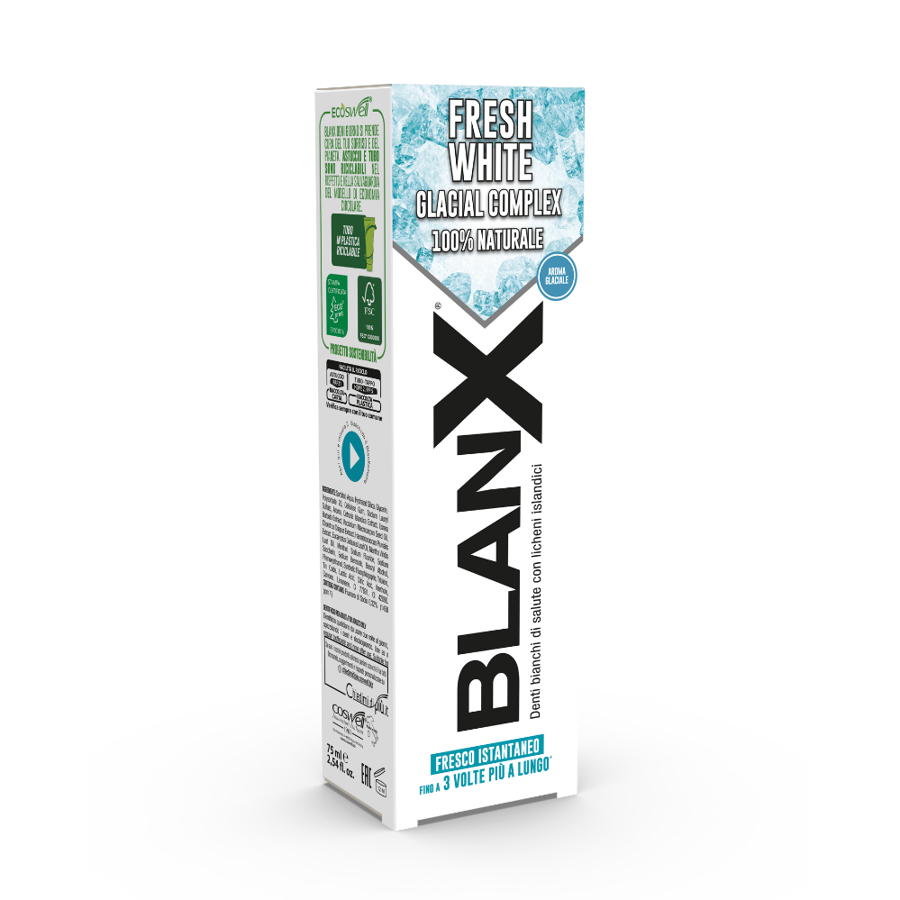 - 100% natural Glacial Complex is a glacial water-based complex that gives the BlanX® formula its highly refreshing effect. The complex is also enhanced by cranberries with antioxidant and anti-inflammatory properties as well as an Icelandic algae rich in mineral salts with emollient properties.