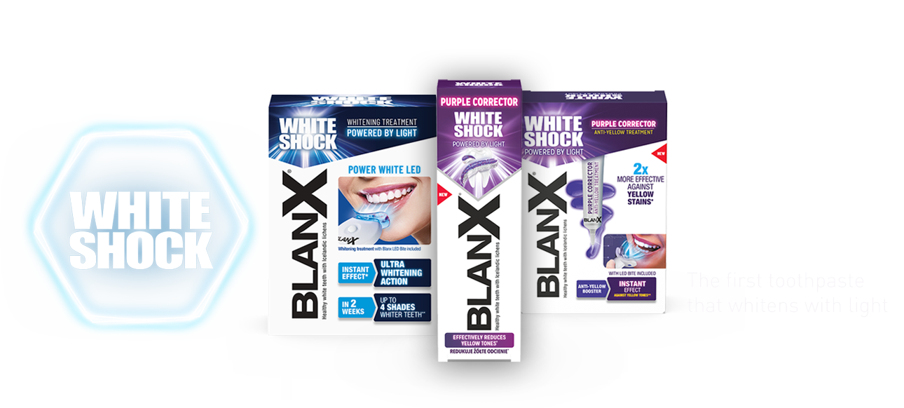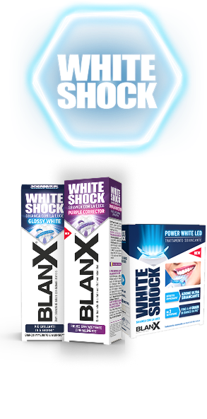 BlanX® White Shock is the first range of products that whitens teeth naturally and without peroxide. The formula has a light-activated effect. When ActiluX®, the active ingredient in BlanX® White Shock, is activated by light, it triggers a photochemical reaction with the oxygen and water in the surrounding environment (moisture in the air and mouth) to produce radicals that are harmless to the human body, but defend it by destroying foreign organic molecules like dirt, environmental contaminants, bacteria and yeasts. This has a whitening and antibacterial effect as the toothpaste acts on the tooth surface by breaking down complex pigment molecules into simpler, colourless molecules and removing the bacterial biofilm that causes tooth decay and numerous oral pathologies. The product adheres to the tooth surface for several hours, creating a protective micro-layer that makes the tooth surface self-whitening and antibacterial. All this is achieved through the action of light. So, even after cleaning teeth, ActiluX® continues to perform its whitening and antibacterial action whenever it is illuminated by sunlight or the light emitted from a suitable source (LED). This process can be accelerated using the devices (LEDs) supplied in White Shock packs as the more light the tooth surface receives, the greater its whitening and antibacterial effect. The active ingredient ActiluX® does not damage teeth because it only acts on the surface, attacking the superficial organic molecules and bacterial plaque that are often responsible for yellowing and dulling the tooth surface. By adhering to the tooth surface for a long period, ActiluX® also continues its whitening and antibacterial action even after brushing. This combats the formation and consolidation of other surface stains caused by food. The active ingredient ActiluX® is not at all aggressive on enamel and also preserves a natural level of moisture on gums and the mucous membrane. For the three formats, the treatment lasts for the following times: BlanX® White Shock 75ml: a whitening, antibacterial action that lasts for many hours after brushing. BlanX® White Shock 50ml + BlanX® Led: a whitening, antibacterial action that lasts for many hours after brushing and is made more intense by the action of the Led light crown that activates ActiluX® when it is still on the toothbrush, so it is already active when it is deposited on the enamel. BlanX® White Shock Intensive Treatment: a whitening, antibacterial action that lasts for several days following treatment using the Led Bite, as the action of the ActiluX®, activated by the LED, is maintained at length on the teeth, resulting in semi-professional whitening. Regarding the length of light exposure required, it only takes a few seconds for ActiluX® to react. The longer the toothpaste is exposed to the Led Bite led light, the more rapid and intense whitening will be.
