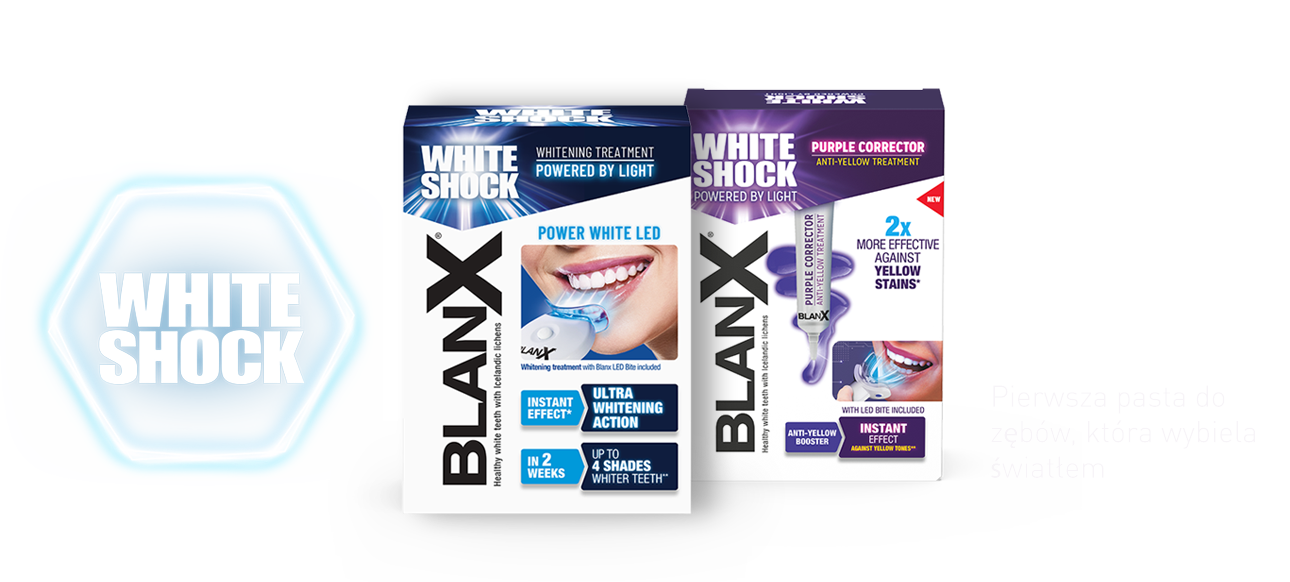 BlanX® White Shock to pierwsza gama produktów, która wybiela zęby w sposób naturalny bez nadtlenku. Formuła działa przez światło: substancja czynna ActiluX® zawarta w BlanX® White Shock aktywuje się przez światło, tworząc reakcję fotochemiczną z tlenem i wodą znajdującą się w otoczeniu (wilgoć z powietrza i ust) i produkuje gatunki rodników nieszkodliwe dla organizmu, ale będące w stanie go bronić, niszcząc obce cząsteczki organiczne, jak brud, zanieczyszczenia ze środowiska i bakterie oraz drożdże. To daje efekt wybielający i antybakteryjny, ponieważ pasta do zębów oddziałuje na powierzchnię zęba, rozbijając złożone cząsteczki pigmentu, na prostsze bezbarwne cząsteczki i usuwając biofilm bakteryjny odpowiedzialny za próchnicę i wiele chorób jamy ustnej. Ponadto produkt pozostaje przez wiele godzin na powierzchni zęba, tworząc mikro warstwę ochronną, która wybiela powierzchnię zębów i zapewnia ochronę przed bakteriami. Wszystko to dzięki działaniu światła i dlatego nawet po skończeniu mycia zębów działanie wybielające i antybakteryjne ActiluX® trwa nadal, aktywując się za każdym razem przy naświetleniu światłem słonecznym i światłem emitowanym przez specjalne źródło (LED). Ten proces jest przyspieszany przez użycie urządzeń (LED) znajdujących się w opakowaniach White Shock, ponieważ dzięki większemu naświetleniu powierzchni zębów, uzyskuje się większy efekt wybielający i przeciwbakteryjny. Substancja czynna ActiluX® nie uszkadza zęba, ponieważ działa tylko na powierzchnię i atakuje powierzchniowe cząsteczki organiczne i płytkę bakteryjną, które często są odpowiedzialne ze żółknięcie i matowienie powierzchni zęba. Dodatkowo Actilux® pozostając na długo na powierzchni zęba zachowuje swoje działanie wybielające i przeciwbakteryjne również po myciu, utrudniając tworzenie się osadów i utrwalanie innych przebarwień na powierzchni spowodowanych jedzeniem. Substancja czynna ActiluX® absolutnie nie oddziałuje agresywnie na szkliwo, natomiast podtrzymuje naturalny stopień nawilżenia dziąseł i śluzówek. Jeśli chodzi o czas kuracji dla trzech formatów: BlanX® White Shock 75 ml: działanie wybielające i antybakteryjne trwa przez wiele godzin po myciu. BlanX® White Shock 50 ml + BlanX® Led: działanie wybielające i antybakteryjne trwa przez wiele godzin po myciu i jest intensyfikowane przez naświetlanie, które aktywuje ActiluX® już na szczoteczce i już w formie aktywnej dociera do szkliwa. BlanX® White Skock intensywna kuracja: działanie wybielające i antybakteryjne trwa przez wiele dni po kuracji z użyciem urządzenia naświetlającego, ponieważ działanie ActiluX® aktywowane przez LED długo utrzymuje się na zębach, sprawiając, że jest to już półprofesjonalna kuracja. Jeśli chodzi o ekspozycję na światło, wystarczy kilka sekund, aby doszło do reakcji ActiluX®. Im dłużej pasta będzie naświetlana światłem Led Bite, tym bardziej intensywne i szybkie będzie wybielanie.