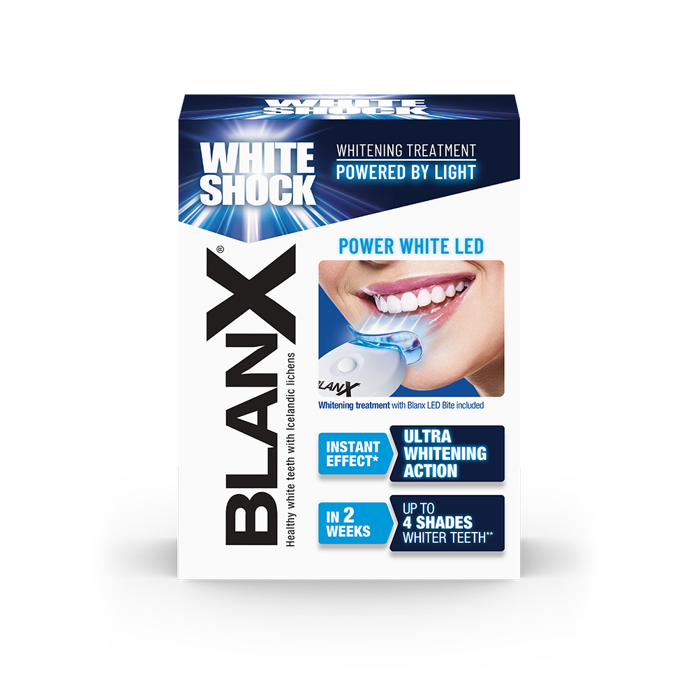 BlanX® Power White Led Treatment sprawia, że Twoje zęby są nawet do 4 odcieni bielsze w ciągu 2 tygodni**, dzięki połączonemu działaniu BlanX® LED Bite oraz wysokiej zawartości ActiluX®. Ponadto Niebieska Formuła zapewnia natychmiastowy* efekt optycznego wybielania, widoczny przy każdym użyciu.